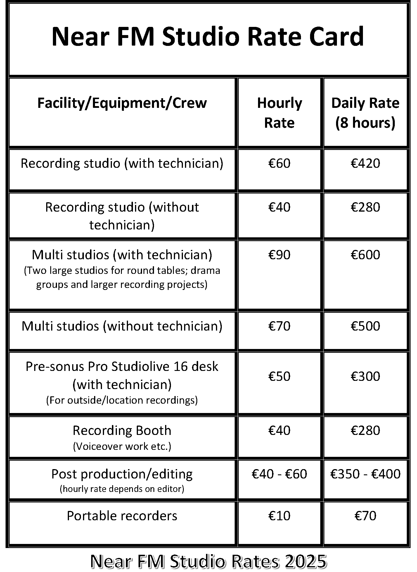 *Rates do not include equipment other than studio gear that is built into the studio. Any additional equipment not provided with the studio can be rented by request if available.